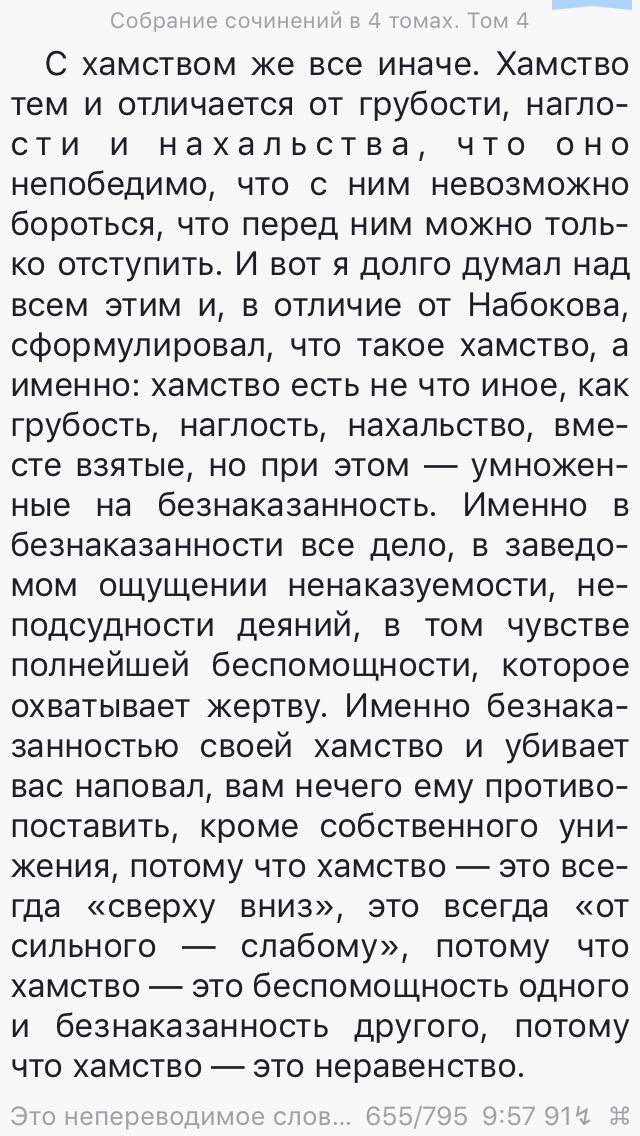 Поэтому, если вы промолчите в ответ на хамство, придя домой вы выплеснете весь ваш негатив не на хама, которого вы впервые видите и быть может никогда более не увидите, а на родных и близких вам людей — на свою семью. Многие хамы, прибегая к неуважительному способу общения, искренне верят в свою безнаказанность. Ваша задача — развеять этот миф. Чем чаще отвечать хаму в жесткой форме, тем реже у него будет появляться желание хамить.