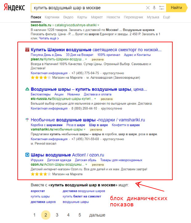 Поисковая система Яндекса отображает на странице с результатами поиска помимо органической выдачи ещё и платные объявления, соответствующие по контексту поисковому запросу.