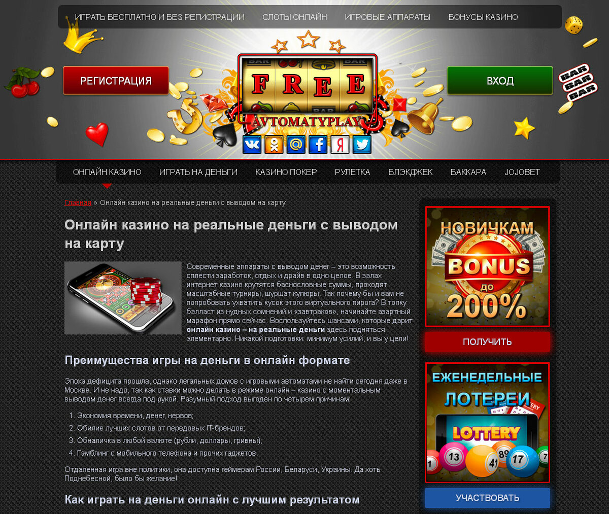 Сейчас нет сложностей, чтобы найти и начать развлекаться в автоматы бесплатно и без регистрации, но что делать тем азартным людям, которые желают играть в карты на деньги? Выход есть. Теперь для этого не нужно искать компанию или специализированное заведение, так как все есть на одном сайте.
