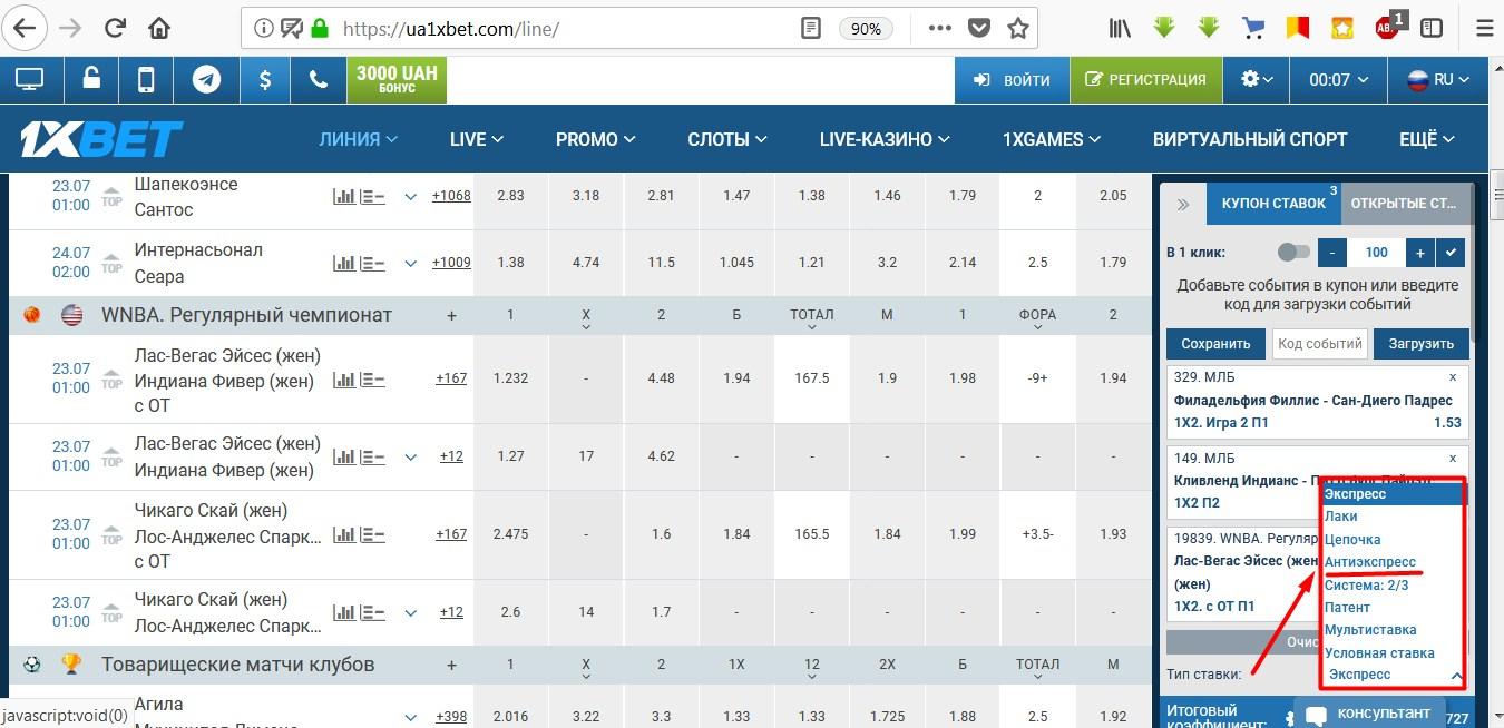 Линия: включает около 20 видов спорта. Есть как крупные спортивные события, так и малозначительные турниры.