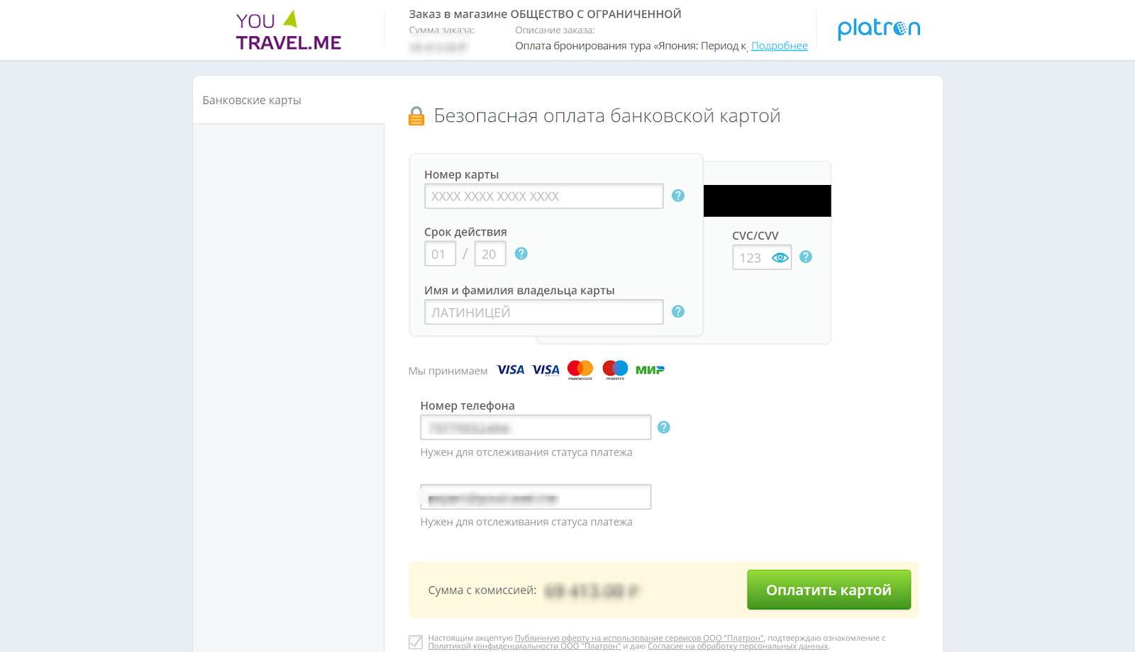 При выборе формы оплаты картой Вы будете переадресованы на страницу, где будет отображена информация о заказе, а также поля для заполнения данных карты.