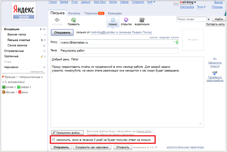 4. Сейчас самое увлекательное. Когда вы завершили трудиться с самим письмо м, нужно его отправить. Дабы оно отправилось адресату механически, т.е. не сразу же позже того как, вы его написали, а через определенное время, внизу под текстом письма обнаружьте надпись «Отправить сегодня в …». Поставьте рядом с ней галочку, дабы активизировать данную функцию.