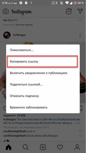 - Откройте Instagram и найдите фотографию, которую хотите сохранить. Нажмите кнопку с тремя точками в правом верхнем углу и выберите «Копировать ссылку».