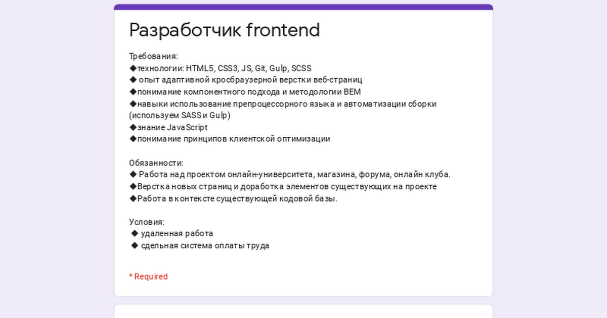 Помните, что вам не нужно выполнять все требования при подаче заявки на вакансию.В том, чтобы стать фронтенд-разработчиком, хорошо то, что вы будете изучать новые языки и фреймворки на работе и в процессе создания собственных побочных проектов. В конце концов, мало кто начинает свою карьеру в качестве специалиста!