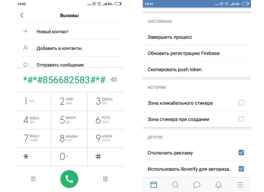 Если вы используете планшет и у вас попросту нет звонилки, то можете скачать программу с Google Play под названием Secret Codes, запустив, она тут же просканирует систему на наличие специальных кодов, после чего пролистав практически в самый низ приложения, вы увидите «Вконтакте — 856682583», нажав на данный код, вы и попадете в меню «ВК-отладка».