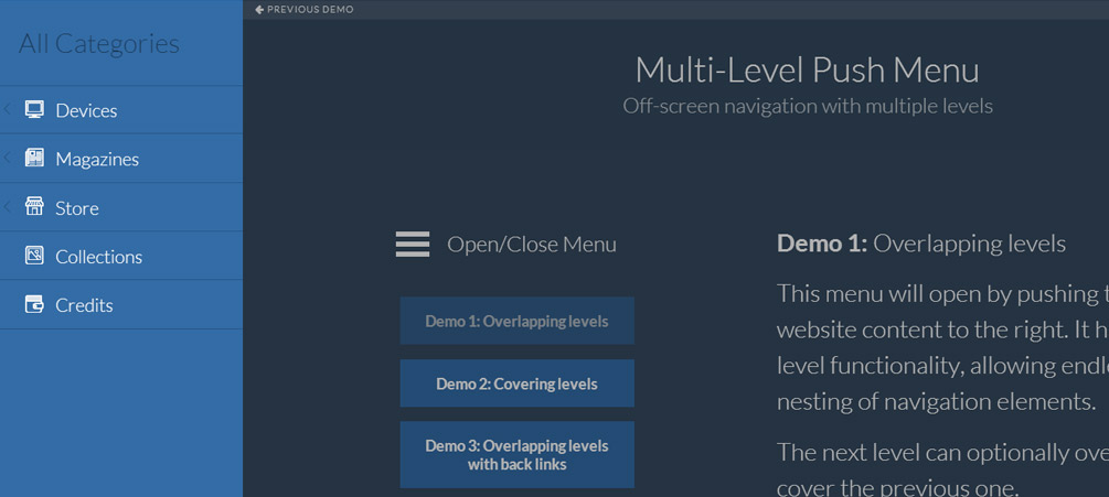 Mmenu — один из самых сложных вариантов мобильного меню. Он использует значок бургера, чтобы указать на его присутствие, и есть классная анимация, когда значок бургера превращается в значок закрытия.Не очень гибкий, но очень близкий к опыту приложения, если это то, что требует ваш клиент.