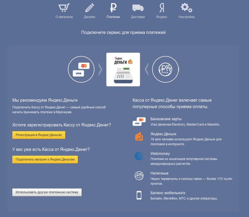 Открываем панель для управления Эквид-магазином и открываем пункт оплаты. Здесь нужно подключить Яндекс кассу.