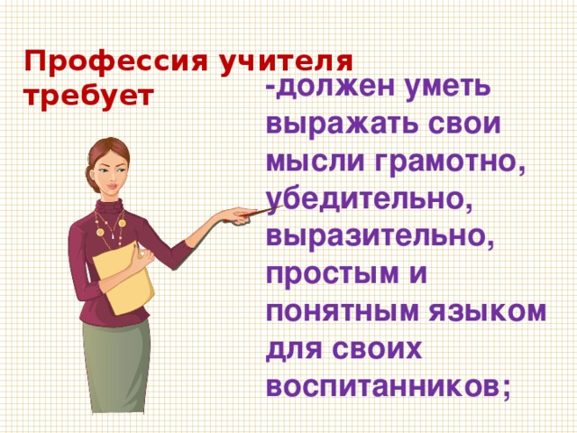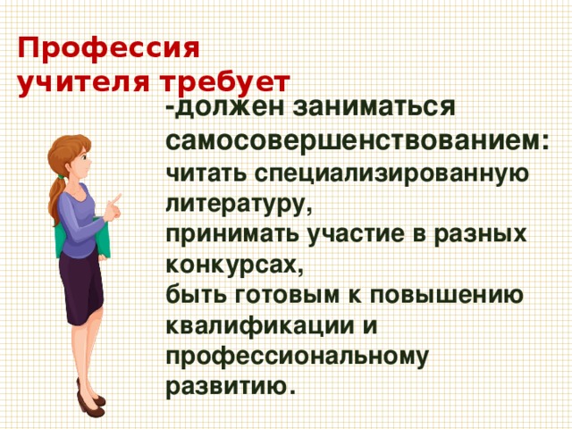 | Необходимые качества, обеспечивающие успешность в профессии: Должен обладать развитыми интеллектуальными способностями (особенно в части вербального интеллекта), высокой концентрацией, умением распределять и переключать внимание, большим объемом оперативной и долговременной памяти, высокой эмоциональной устойчивостью — выдержкой, самообладанием, развитыми коммуникативными качествами — доброжелательностью, чуткостью, тактом, сопереживанием, хорошей дикцией, способностью к яркому и логически выстроенному изложению материала, энергичностью, работоспособностью, умением увлечь своим предметом, высокой общей культурой. Желательна приятная внешность и тембр голоса. | |