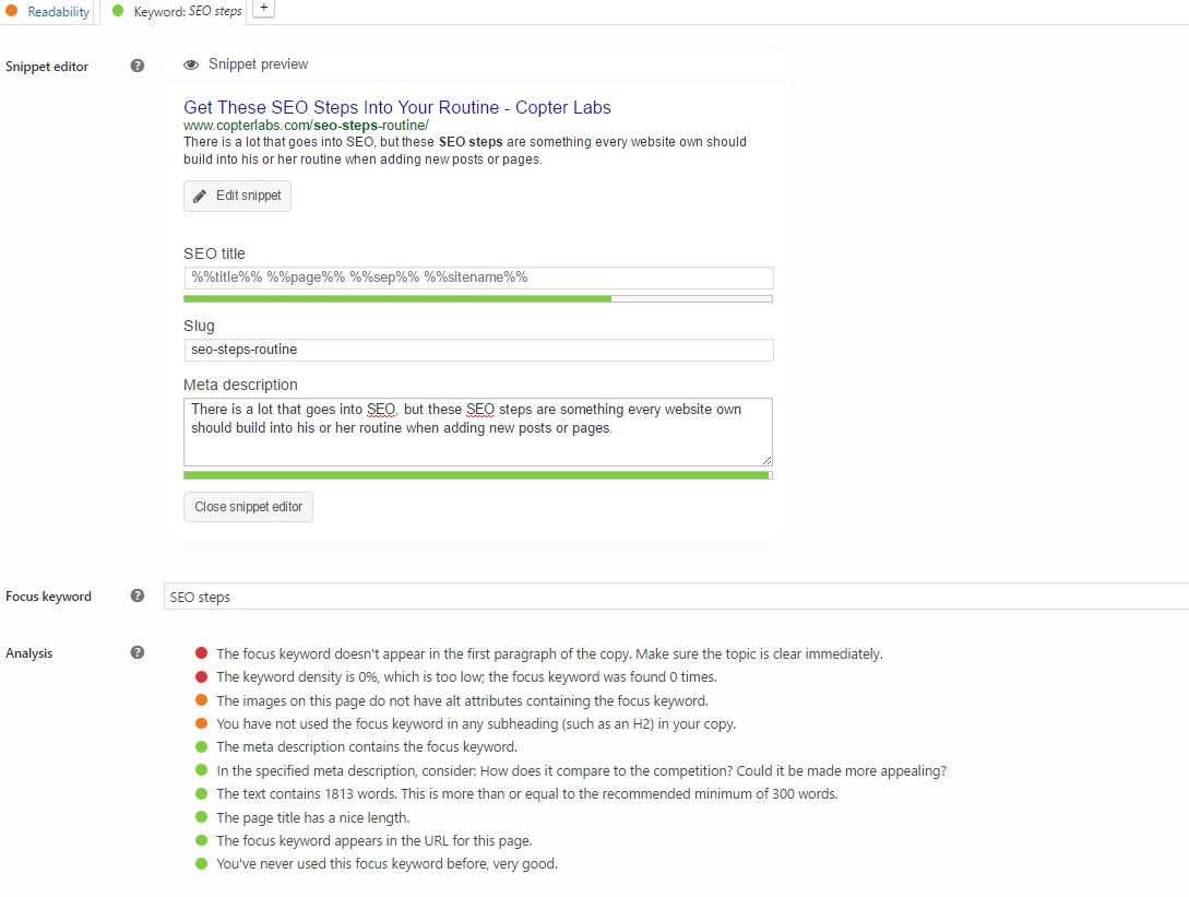 Для SEO важно, чтобы присутствующий на сайте контент был связан с выбранной лексикой. Для каждой страницы определяется одно-два ключевых слова, которым соответствуют заголовки и метатеги и по которые используются для проверки успешности продвижения.