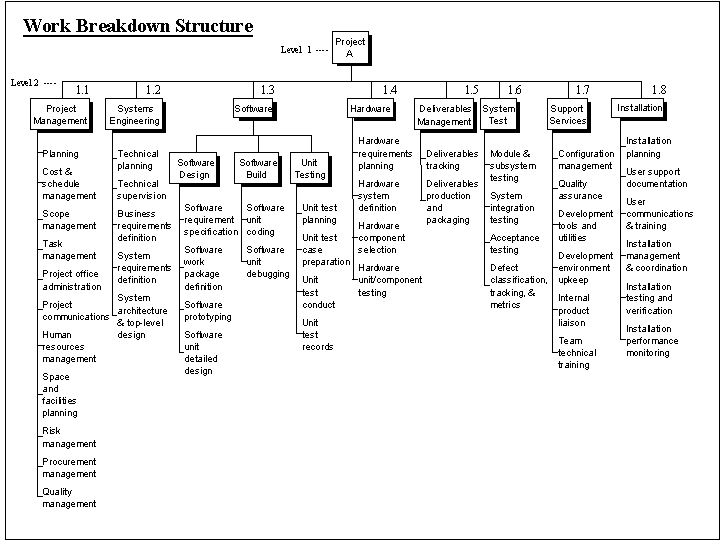 Een WBS — это прекрасный проектор, который представляет собой проект, созданный командой binnen een, в Regelbare deeltaken. De hiërarchische structuur — самое лучшее в het oog springende kenmerk van een WBS. Daarnaast kenmerkt het zich door het visuele uiterlijk, waardoor het voor een projectteam direct duidelijk welke bijdrage van hen verwacht wordt, tijdens het project.Elke niveau van de WBS geeft gedetailleerde informatie over de betreffende deeltaken.